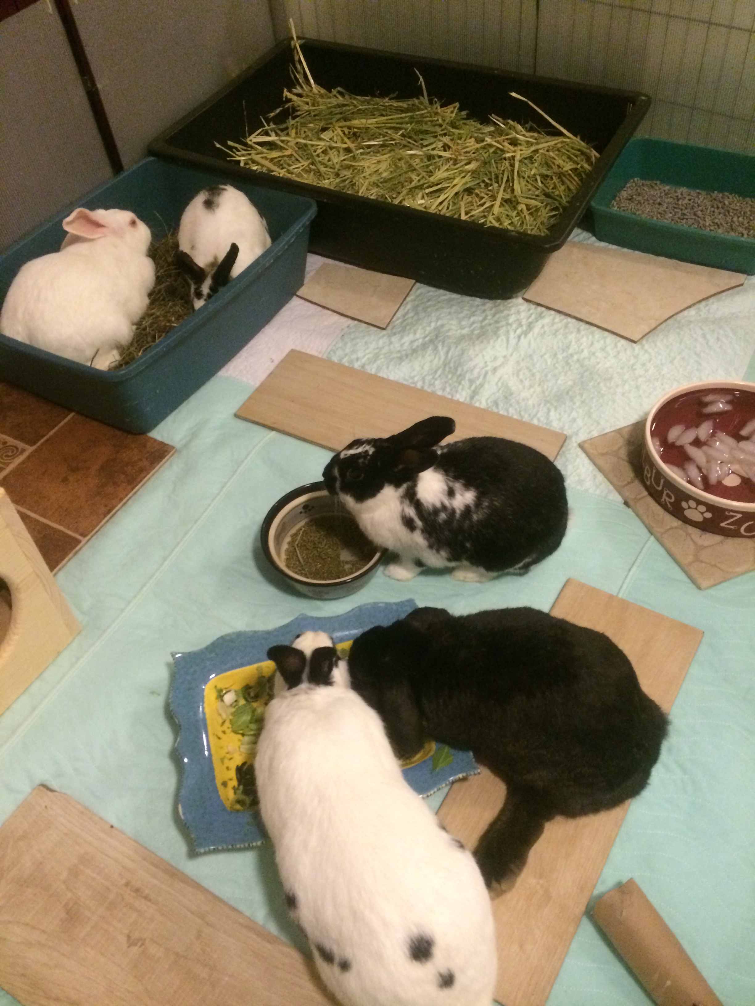 Emma and Oso are eating hay in the litter box, while Whoppy is having some pellets and Zoe and Wilbur are finishing up the last of the lettuce.In a nutshell, a rabbit’s diet should be 75-80% hay, 15-20% fresh vegetables, 5% pellets and treats. Other sources may say 75% hay, 20% pellets and 5% fresh vegetables and fruits. The reason for this is because pellets are packed with all the vitamins and minerals a rabbit needs to stay healthy. However, too many pellets can cause obesity and soft stools. Fresh vegetables are “wet fibre,” which still provides nutrients and water, and limits the amount of sugar. Vegetables also add interest in their diet and make dinner time exciting. Of course, unlimited fresh water should also be available. Rabbits actually consume much more water per body weight than many other animals, such as dogs, so make sure there is always water present.