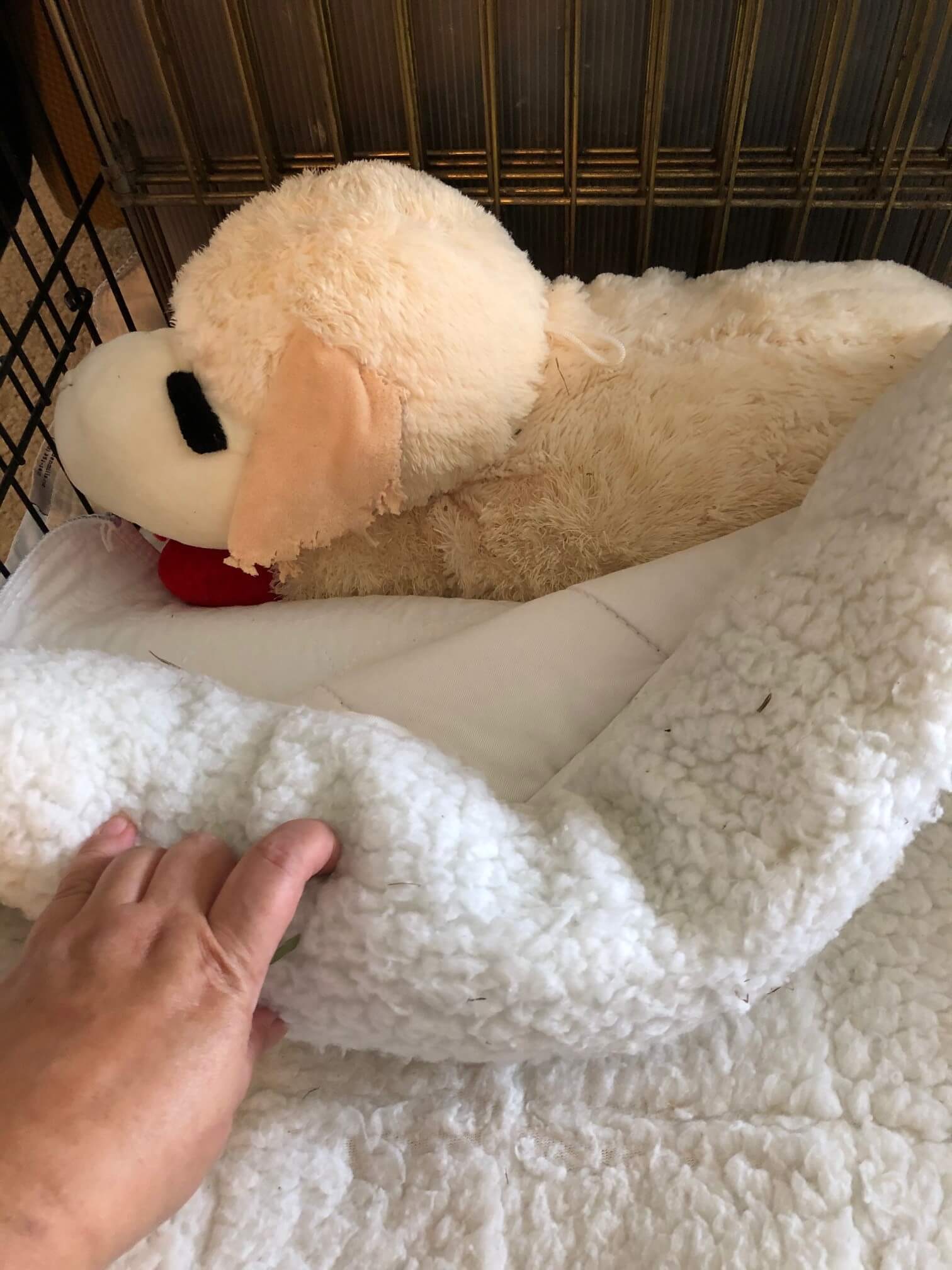 10. Another washable pee pad is placed on top. This ensures everything underneath stays clean.11. A handmade fleece pillow is placed on top. This will be changed twice daily. |